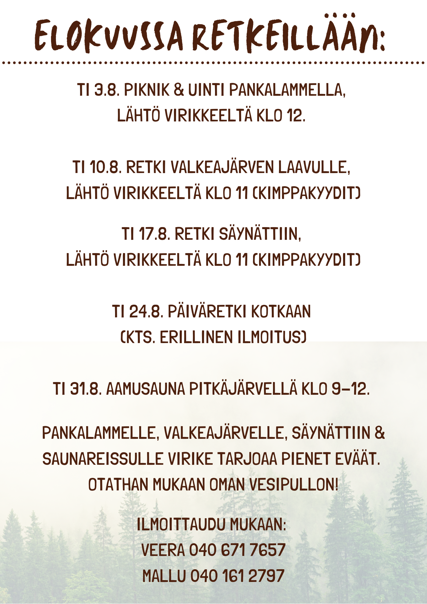 Tauon ajaksi on ajastettu Facebookiin & Virikkeen kotisivuille mainoksia elokuun retkistä. Jokaisesta mainoksesta löytyy lisätietoa retkestä ja ilmoittautumistiedot ? Ihanaa kesää kaikille!