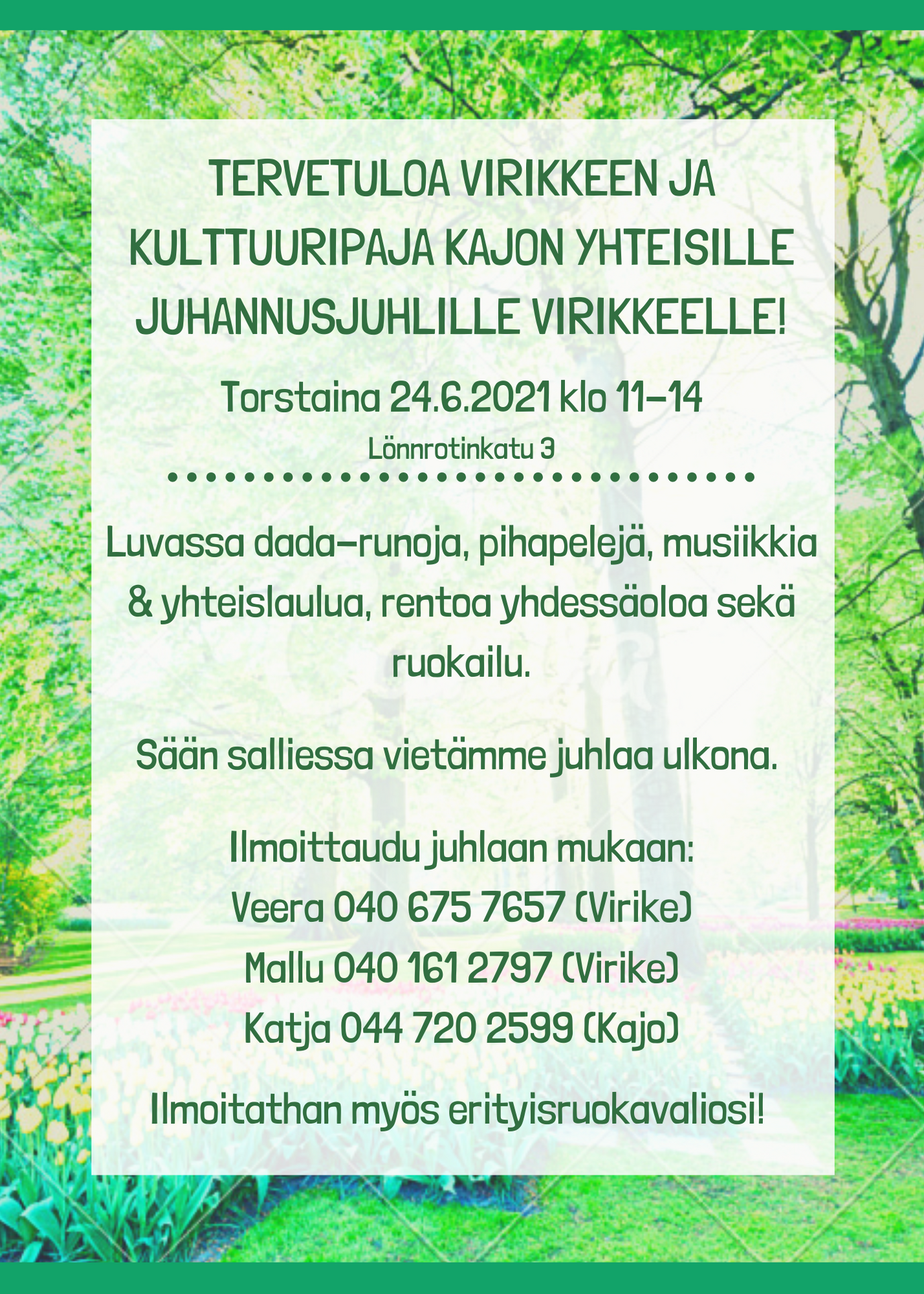 Virikkeen toiminnassa on kesätauko 5.7.-1.8. Olemme tavoitettavissa tauon jälkeen ma 2.8. ja kohtaamispaikka on jälleen avoinna ke 4.8. klo 10-16. Elokuussa kohtaamispaikka on tiistaisin kiinni retkipäivien vuoksi.