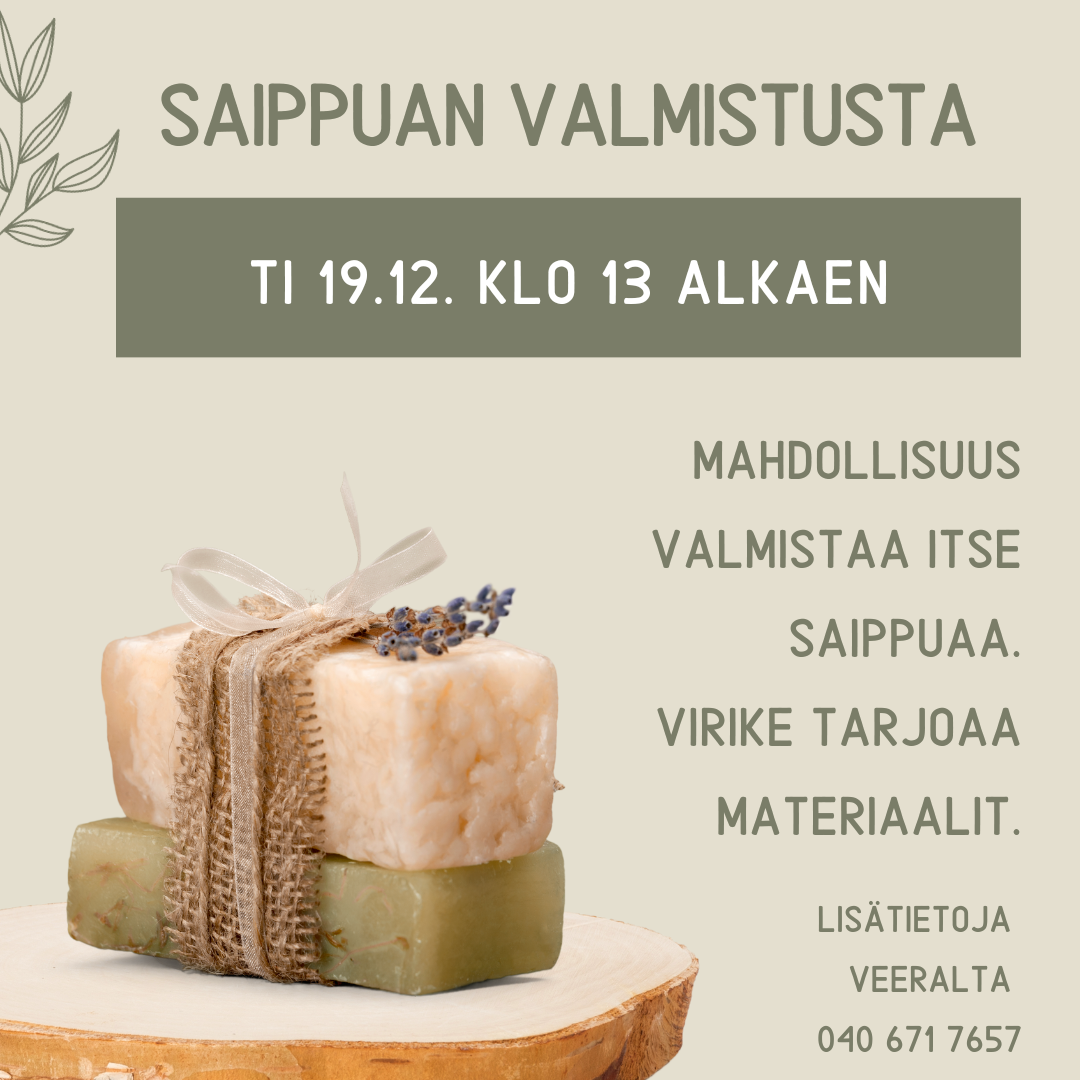 Saippuan valmistusta ti 19.12. Julkaistu 30.11.2023 by Veera Salonen Ilmoittaudu mukaan Veeralle 040 671 7657!