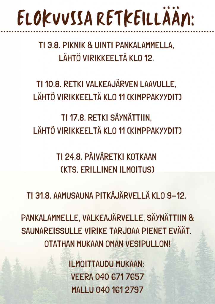 Elokuussa retkeillään tiistaisin!