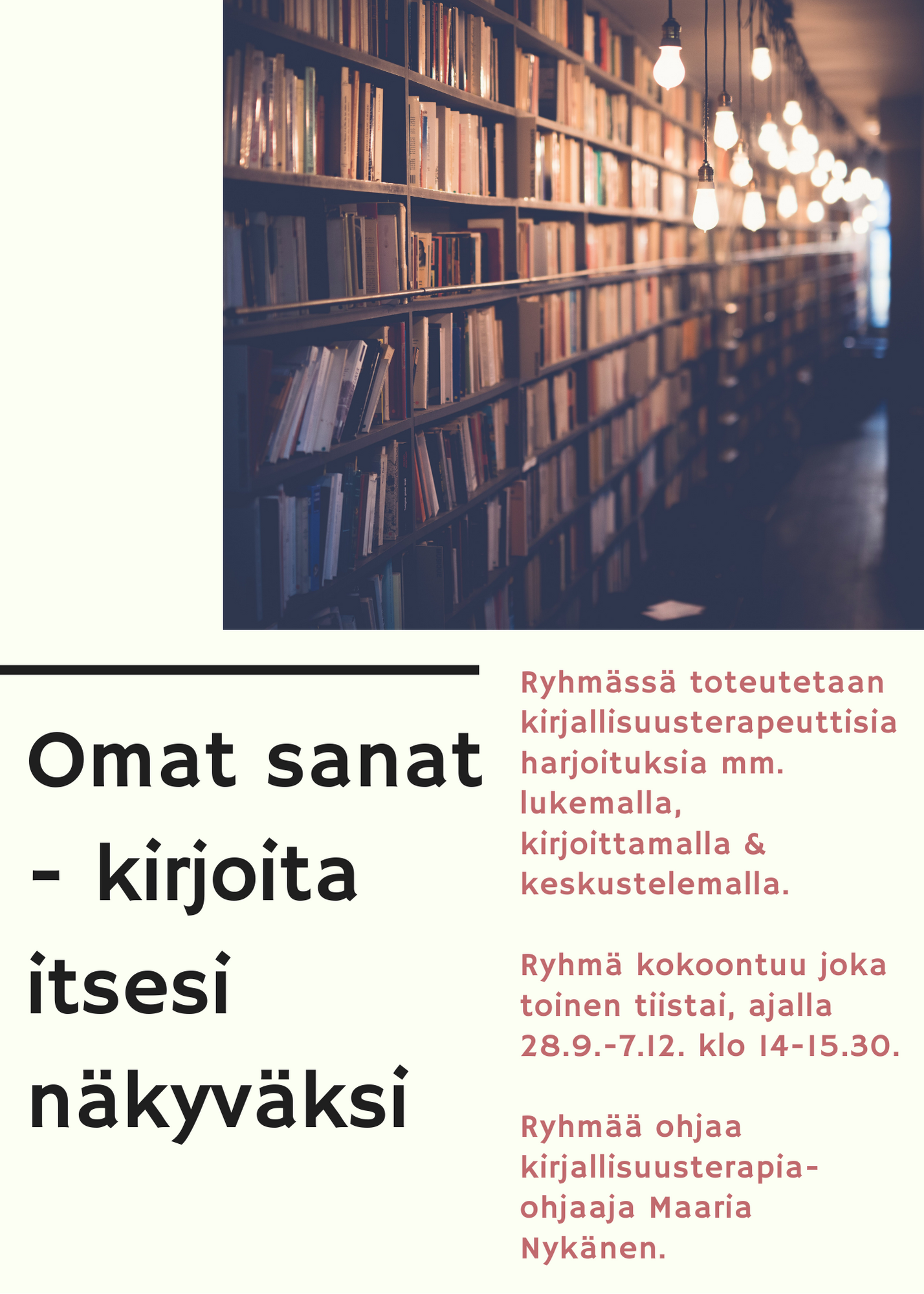 Omat sanat – kirjoita itsesi näkyväksi -kirjallisuusterapeuttinen ryhmä Julkaistu 9.9.2021 by Veera Salonen