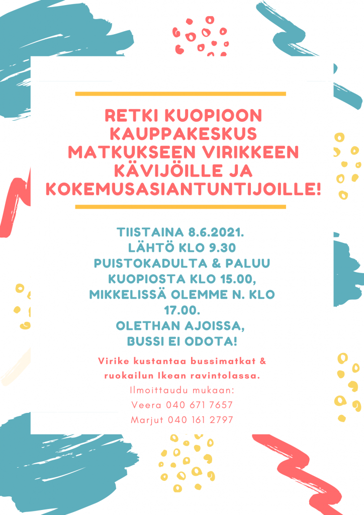 Retki Virikkeen kävijöille & kokemusasiantuntijoille Kuopioon kauppakeskus Matkukseen ti 8.6. Julkaistu 24.4.2021 by Veera Salonen